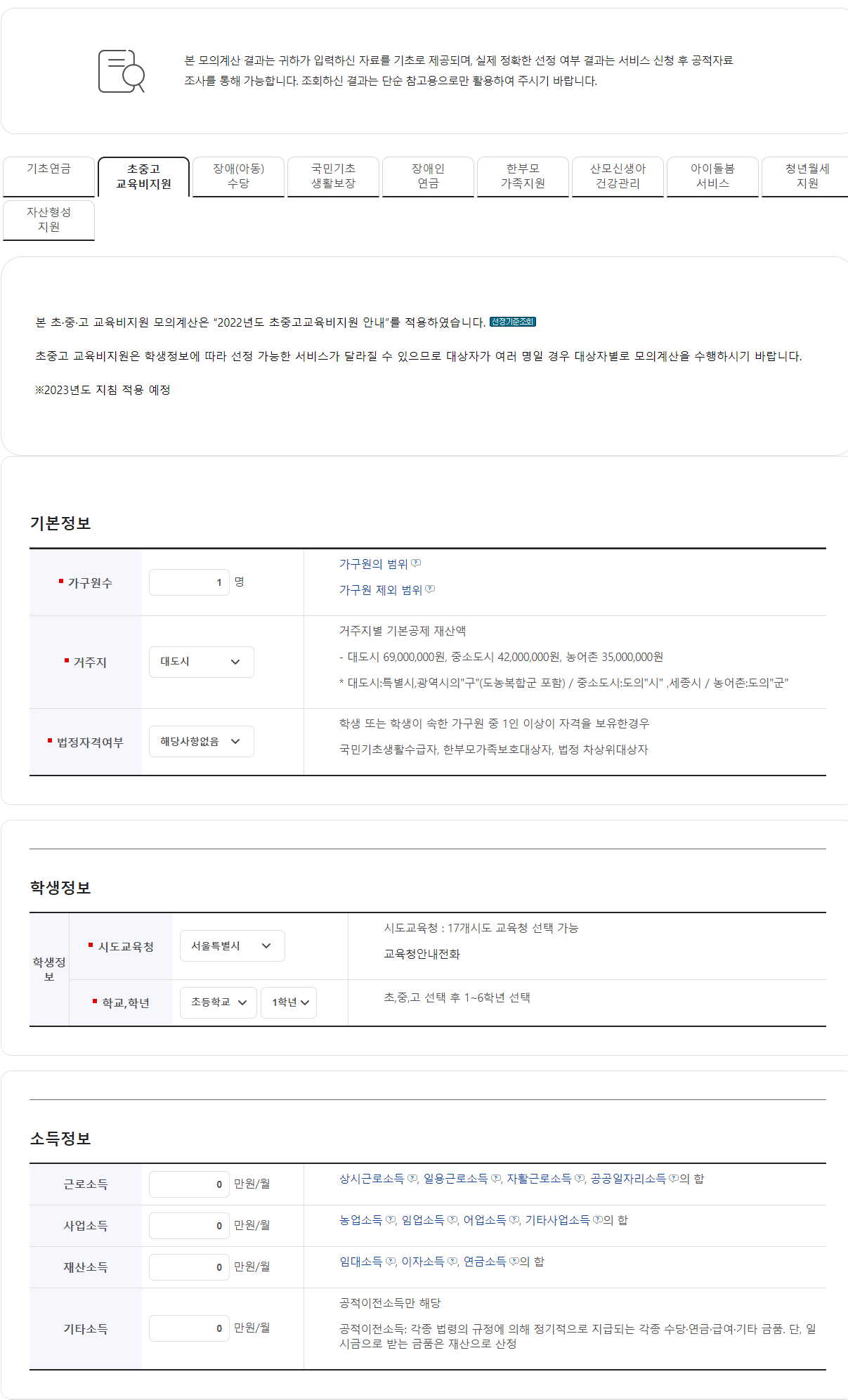 간단한 소득재산 항목을 입력하여 사업별 수혜대상 자가진단이 가능하네요.